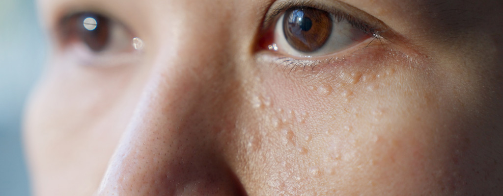 1. برجستگی‌های کوچک سفید یا زرد: میلیا به شکل نقاط ریز سفید یا زرد رنگ در زیر پوست دیده می‌شود. این ضایعات برجسته هستند و از پوست اطرافشان به راحتی قابل تشخیص‌اند.
